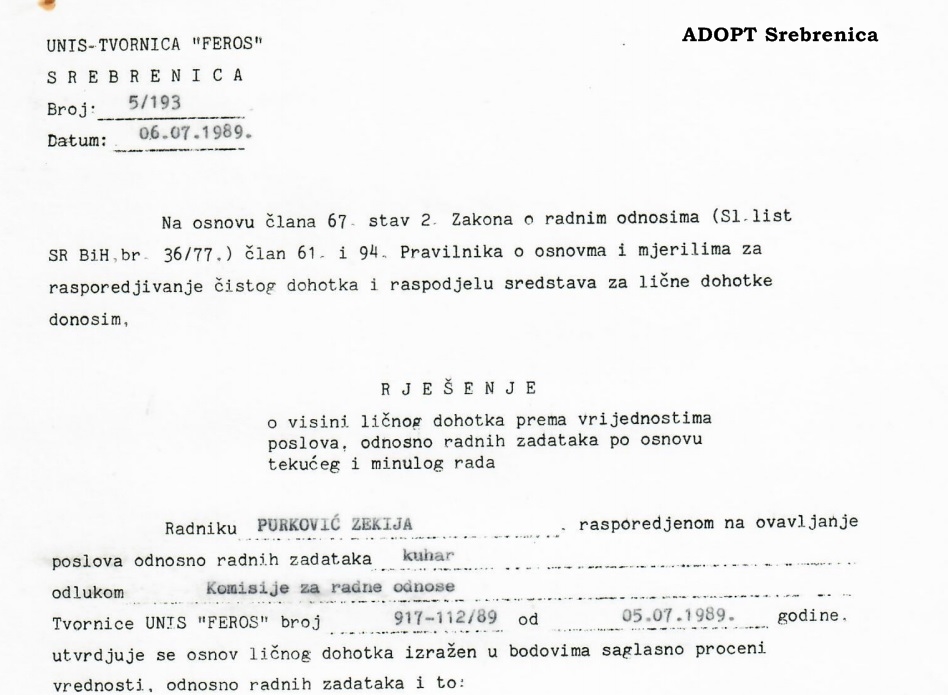 No:3-3-0-ZP20; Rješenje o visini ličnog dohotka prema vrijednostima poslova, odnosno, radnih zadataka, po osnovu tekućeg i minulog rada; Radnika: Zekija Purković, kuharica; Broj: 5/193; Naziv i adresa radne organizacije: UNIS-Tvornica "Feros" Srebrenica;