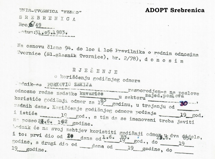No:3-3-0-ZP7; Rješenje o korišćenju godišnjeg odmora za radnicu: Zekija Purković, kuharica; Broj: 6/49; Naziv i adresa radne organizacije: UNIS Tvornica "Feros" Srebrenica;